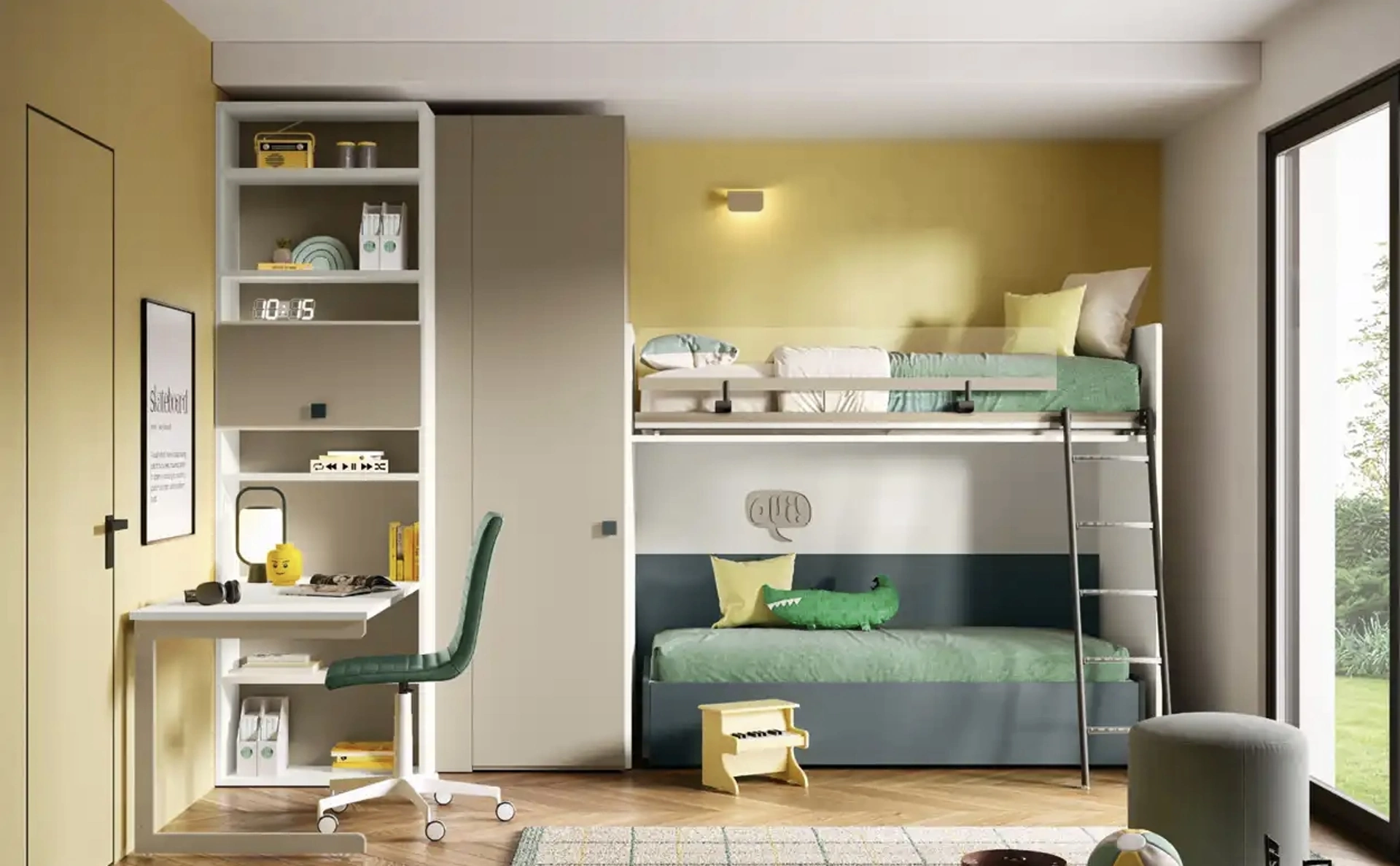 Con questa cameretta K114 Moretti Compact Camerette, tra le soluzioni con letti a castello, potrai ammobiliare stanze moderne per bambini.