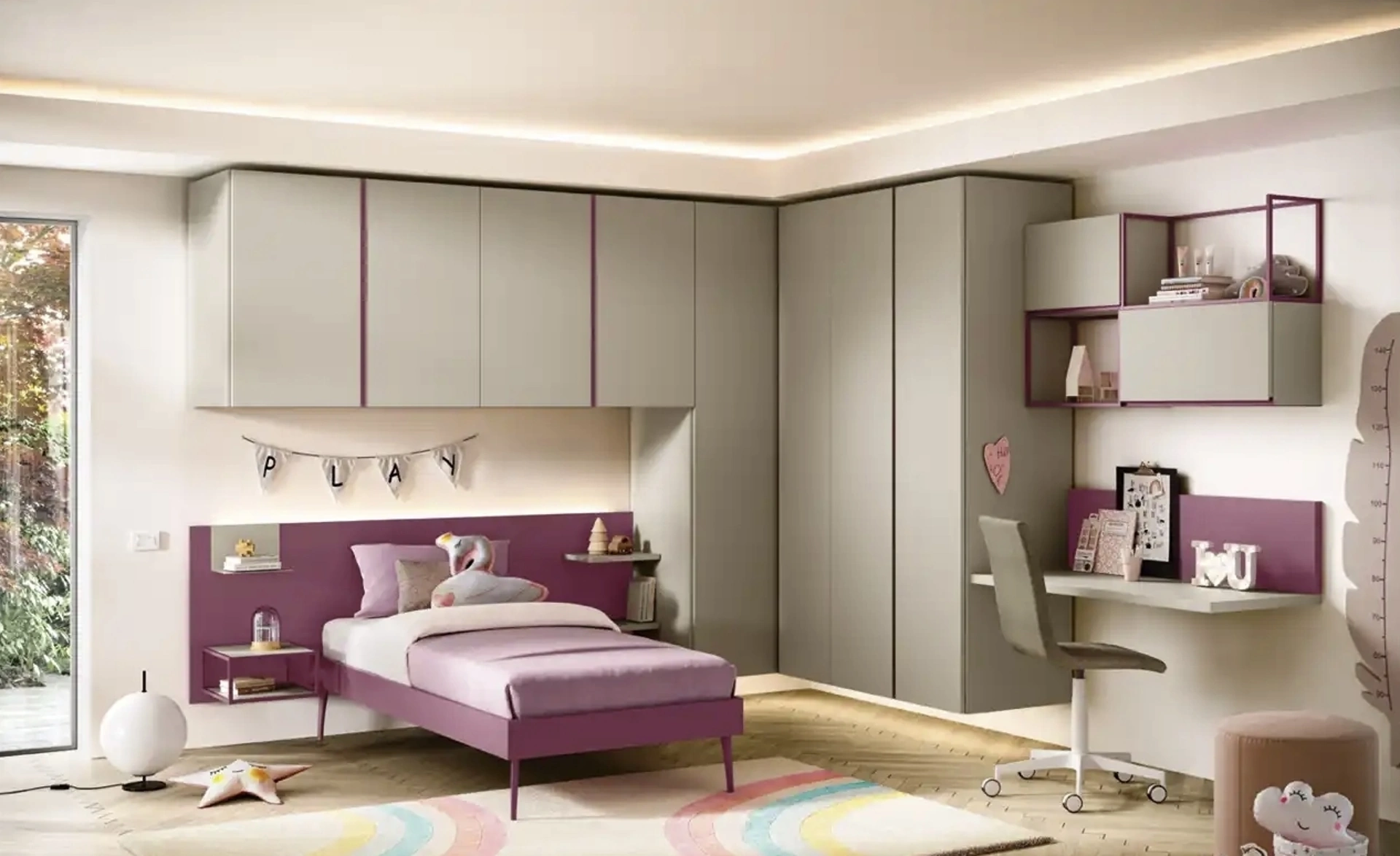 Con questa cameretta K116 Moretti Compact Camerette, tra le soluzioni a ponte, potrai arredare stanze moderne per bambine.