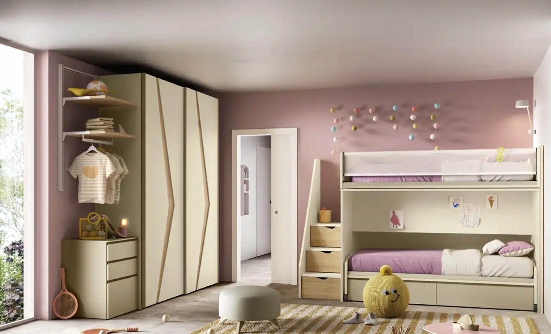 Con questa cameretta K125 Moretti Compact Camerette, tra le soluzioni con letti a castello, potrai progettare stanze moderne per bambine.