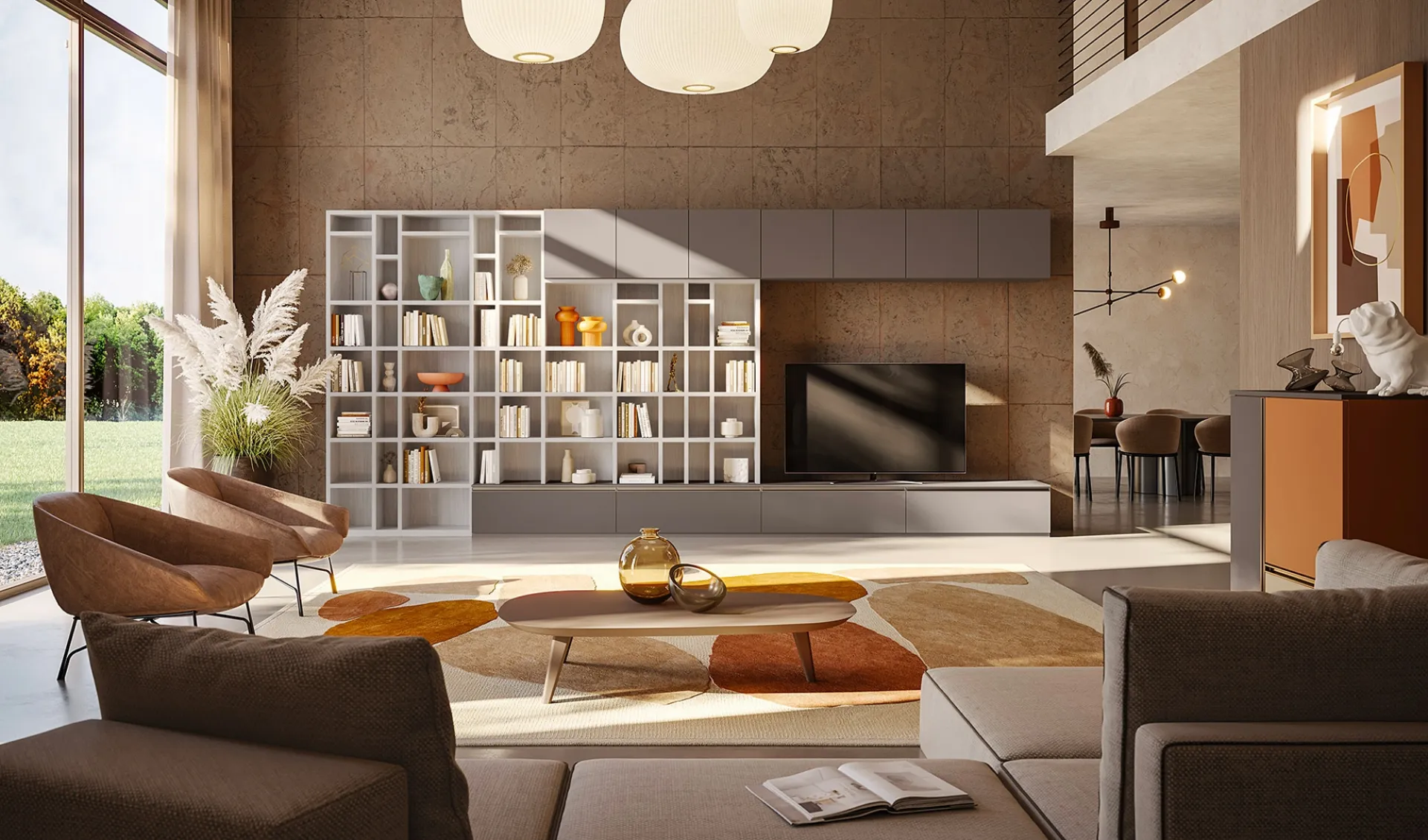 Texture di pregio e forme decise: scopri la libreria Libreria LV728 di Giessegi tra le più esclusive Librerie moderne a muro.